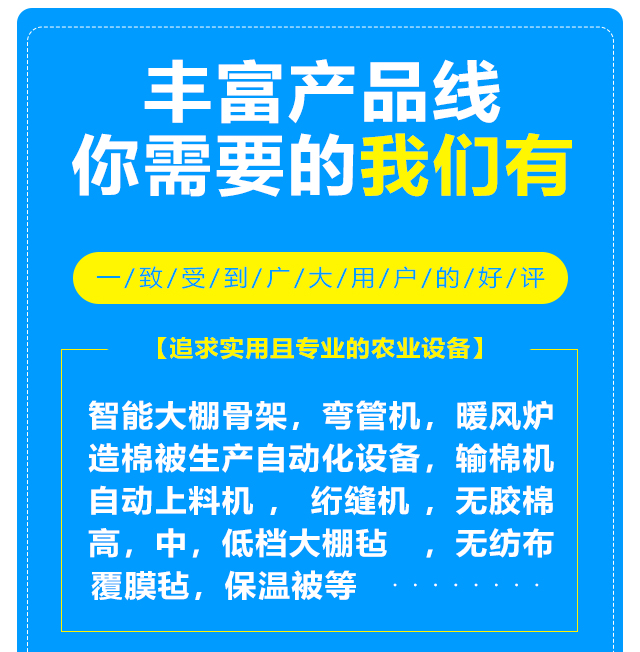 本公司設(shè)備齊全,可生產(chǎn)智能大棚骨架,彎管機(jī),暖風(fēng)爐等農(nóng)業(yè)設(shè)備,另制造棉被生產(chǎn)自動(dòng)化設(shè)備,自動(dòng)上料機(jī),輸棉機(jī),絎縫機(jī)等。質(zhì)量可靠,注重創(chuàng)新。公司擁有雄厚的實(shí)力,先進(jìn)的生產(chǎn)線,豐富的經(jīng)驗(yàn),可根據(jù)客戶的要求定做高,中,低檔大棚氈,無(wú)紡布,無(wú)膠棉,覆膜氈,保溫被等,車(chē)間日生產(chǎn)新型棉被10000平方米以上,能滿足各種客戶的需求,新型保溫被產(chǎn)品在國(guó)內(nèi)研發(fā)中始終保持在前列。