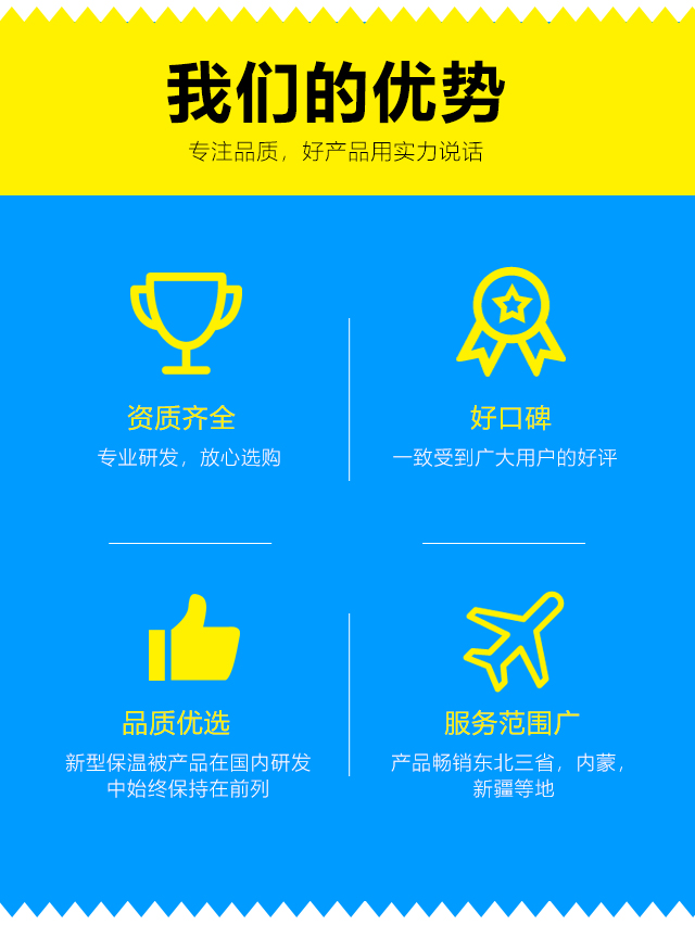 我們本著客戶之上,服務(wù)至上的原則,爭(zhēng)創(chuàng)國(guó)內(nèi)保溫被行業(yè)的引導(dǎo)者。
